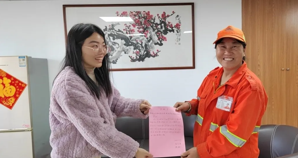 事后,失主阮女士當(dāng)面感謝了這位拾金不昧的環(huán)衛(wèi)工人,并通過一封感謝信對(duì)他們細(xì)心的工作和熱情待人的態(tài)度表達(dá)感激。